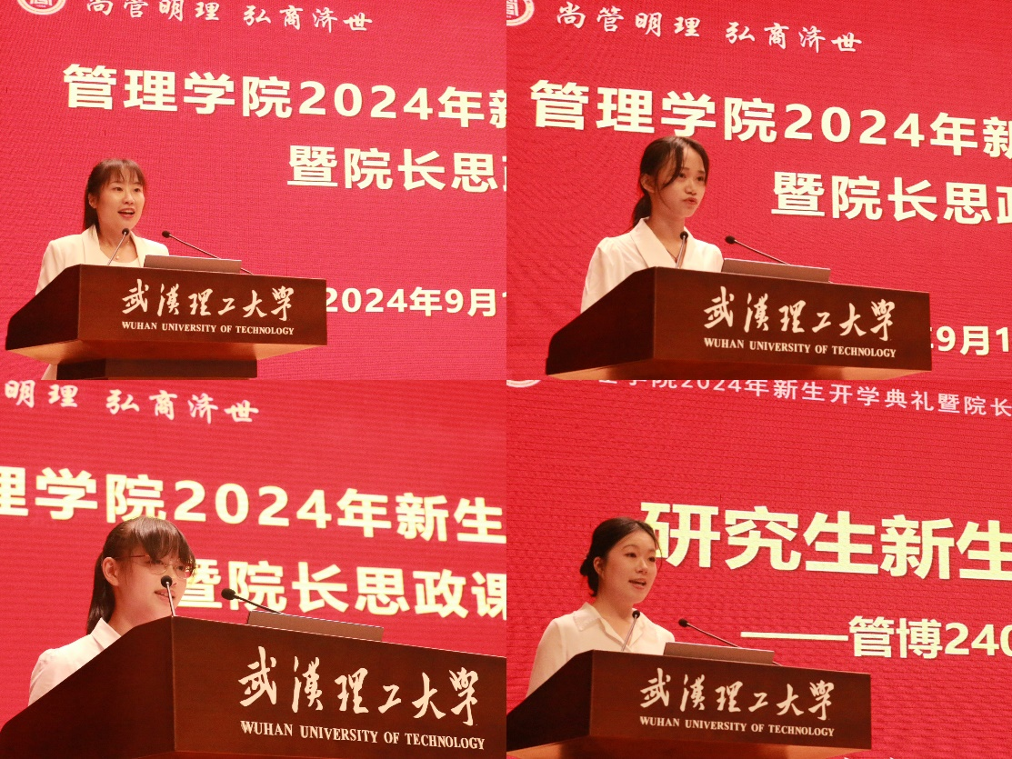 湖北省五一劳动奖章获得者李殊琦老师作为教师代表讲述,并向新生分享了成长经历,勉励同学们要精心绘制知识探索、职业发展、人生成长的三幅蓝图。老生代表管研2301班程静娴结合自己参与志愿服务、创新创业竞赛的成长经历,鼓励学弟学妹们要沉下心勤学提升素养,躬下身实践丰富体验。2024级本科新生代表吉紫萌分享了入学感受,表示要与全体新生一道,谨记厚德博学,追求卓越的校训,在时代的浪潮中乘风破浪,展现太阳成集团tyc9728学子的风采。2024级博士刘惟伊作为研究生新生代表发言,她谈到作为管院学子要将管理理论与中国实践相互结合,在追求大我中成就小我,用实际行动展现当代管院青年良好的精神风貌。